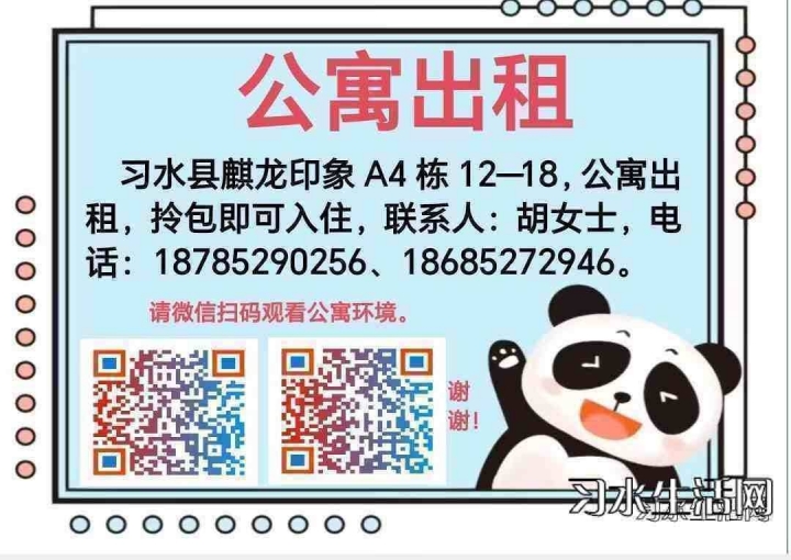 习水县麒龙印象A4栋12—18,公寓出租,拎包即可入住,请微信扫二维码观看公...